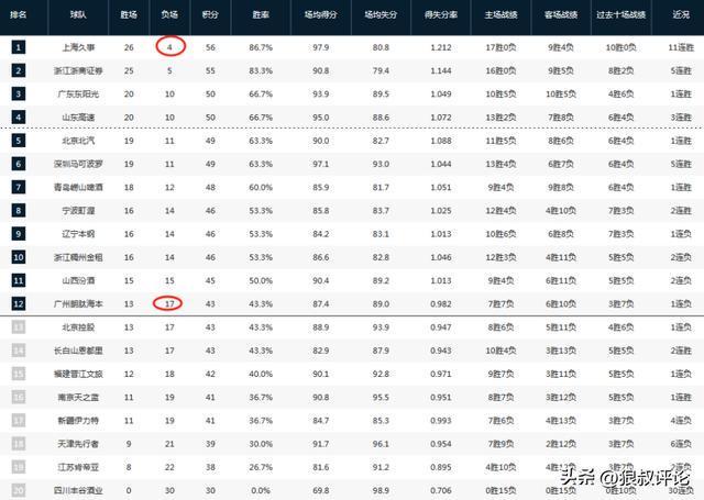 广州男篮总战绩来到了13胜17负排在积分榜第12位,目前积分榜领头羊上海男篮总战绩为26胜4负,这就意味着上海男篮接下来12场常规赛全输,广州也追不上,上海提前12轮锁定季后赛名额。